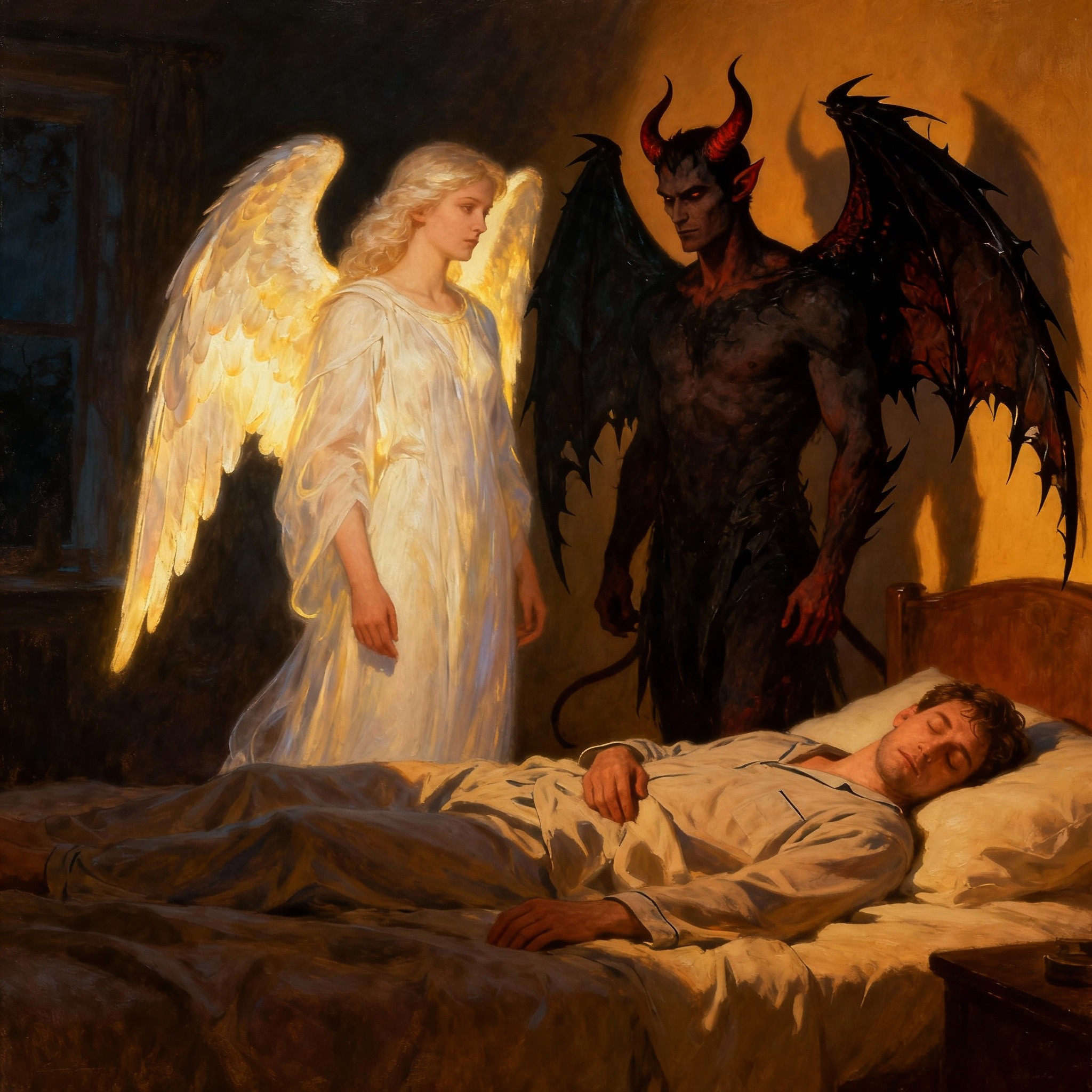 Marco si era quindi diretto da Enrico che a quell’ora della mattina ancora dormva e vide con sorpresa che accanto al letto di Enrico si trovava un essere molto bruno, quasi nero, grande e con le ali come le sue. “Che cosa fai qui, sono io adibito ad Enrico” disse pensando che fosse un altro angelo custode pur meravigliandosi per quel colore scuro. “Io sono Piero, il diavolo custode di Enrico” “Il diavolo custode?” esclamò Marco “Che cos’è questa novità? Non ne sapevo nulla ma comunque stai lontano dal mio assistito” “ Devi sapere, Marco, come vedi conosco anche il tuo nome, che da svariati secoli esistiamo noi, diavoli custodi, solo che hanno deciso che non ci tenessimo più nascosti ed entrare in competizione palese” “Vattene via demonio, già dovresti vergognarti di essere un diavolo, se è vero quello che hai detto, e adesso vuoi anche entrare in coccorrenza con me!”