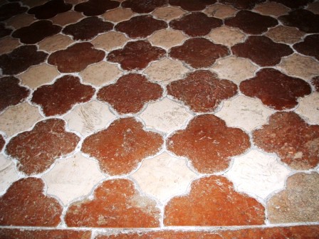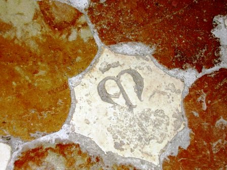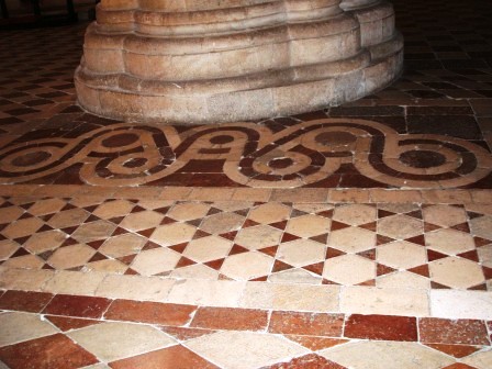 La decorazione più cospicua e significativa è quella pavimentale, che, per alcuni, indica la progressione in una via di perfezione. La prima parte è costituita da quattro tappeti di losanghe bianche e rosse, che si possono inscrivere in una vesica piscis. Tali losanghe, assimilate al “pesce” potrebbero alludere alla corrente delle acque da risalire, fino alla fonte.