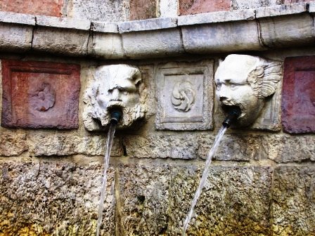 Senza entrare nella difficilissima interpretazione delle teste e della successione numerica sulle tre pareti da cui escono le cannelle (in cui alcuni hanno voluto vedere massonerie e baphometti che, a quei tempi… non erano assolutamente presenti) vorremmo ricordare invece la presenza “anomala” di alcune formelle, come quella priva di fiore (ottagonale o pentagonale come in tutte le altre) e costituita da un concio bianco con un doppio cerchio centrale, presumibilmente marmoreo e apparentemente più tardo. Non ce la sentiamo di avallare l’ipotesi di una rappresentazione stellare con i mascheroni che starebbero a significare il succedersi delle costellazioni allora conosciute.