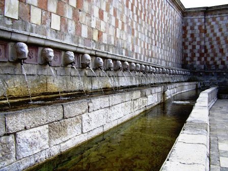 A coloro che amano invece i giochi d’acqua può essere fornito un piccolo suggerimento acustico, che non ci sembra sia stato studiato da alcuno (più evidente in assenza di turisti schiamazzanti) che ricorda i giochi acustici assai più evidenti, ad esempio nelle stanze di palazzo Farnese di Caprarola o, ancor meglio, nella fontana dell’”Organo” di Villa d’Este. Tale particolarità consiste nella deformazione del suono fino al suo quasi annullamento, causata dalla particolare angolazione delle mura perimetrali. Più evidente nella parete esposta a Nord est. In alcuni punti, ad esempio, il brusio delle cannelle tende a scomparire e a uniformarsi. In altri il gioco d’acqua diventa assai più articolato e ardito. In altri ancora è evidente l’enfatizzazione del medesimo, soprattutto in prossimità dell’angolo acuto dove è presente la cannella del “pesce” o del Colapesce o dell’uomo pesce, da molti richiamata con una funzione analoga alle pietre d’angolo basilicali, (vedi foto) e connessa più o meno correttamente alla funzione regale federiciana. (Non dimentichiamo che L’Aquila, con i suoi emblemi imperiali, viene fondata da Federico II, in evidente opposizione alla Roma del tempo).