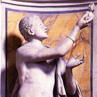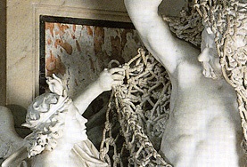 Senza voler aprire particolari polemiche e ascender “per li rami” senza che gli stessi offrano particolari sicurezze, abbiamo pensato perciò di limitarci a selezionre alcuni richiami simbolici ripetitivi, anche se nascosti, presenti nella successione degli straordinari gruppi marmorei. L’analisi di tali particolari è stata effettuata, nell’ora e mezza di tempo concesso per la visita, da Claudio Lanzi. Ci siamo soffermati a lungo sulle numerose figure alate presenti nella cappella e, in particolar modo, sui due angeli ai lati della porta d’ingresso, che sovrastano le due acquasantiere (v. gli articoli, su questo sito, dedicati alle fontane). C’è una notevole differenza d’atteggiamento fra l’angelo “meditante”, che ricorda vagamente la melanconia del Durer, e quello piangente e assai differente come corredo simbolico. |
